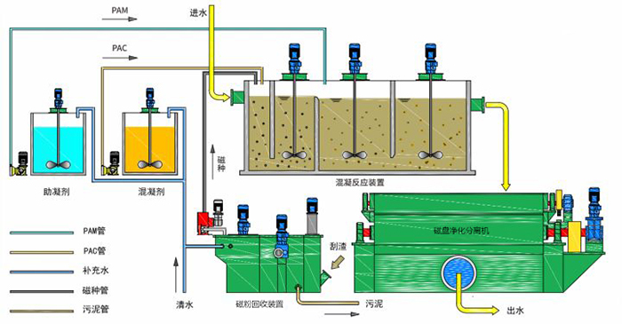 工艺流程简述 (1)污水泵从取水点抽水进入混凝反应器,与一定浓度磁性物质混合均匀;