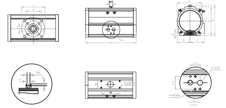6、外部结构一样的执行器有双作用工和单作用式(弹簧复位)供选择.便于安装输出的所有附件。